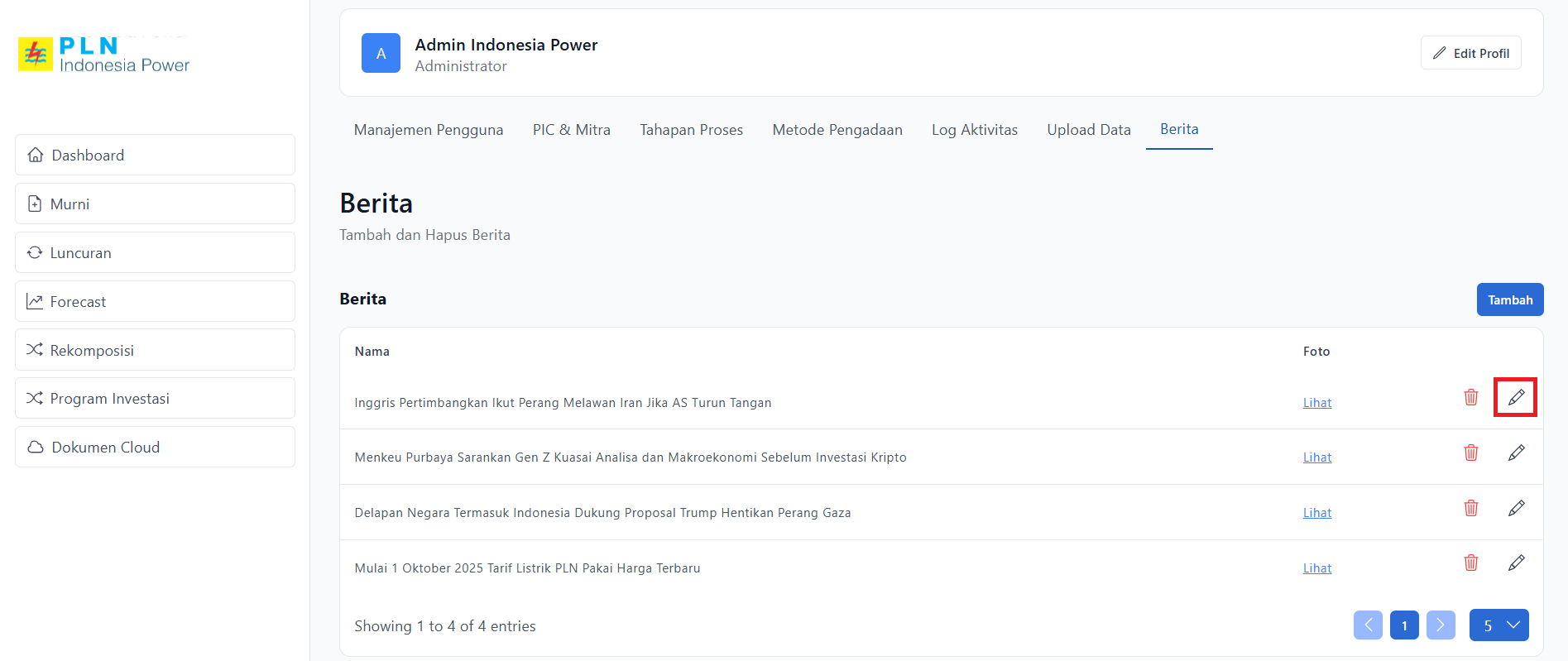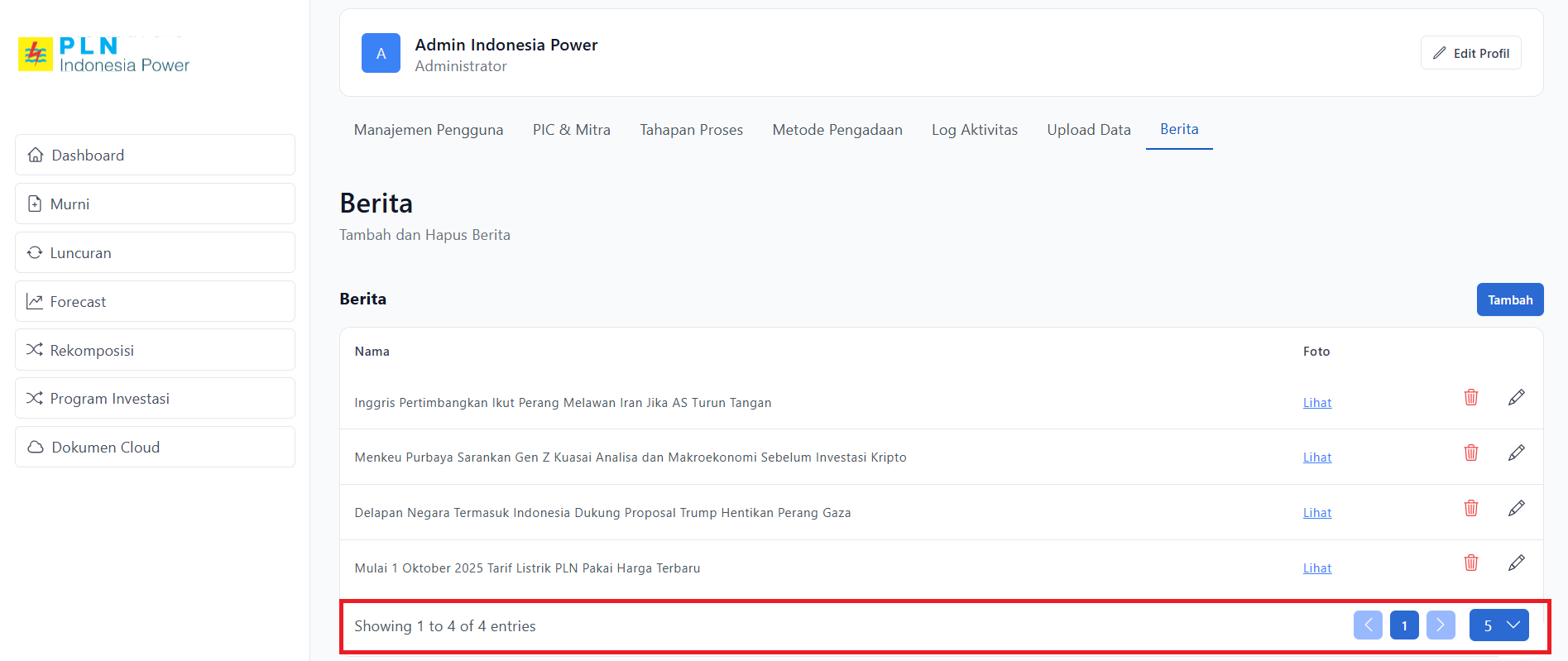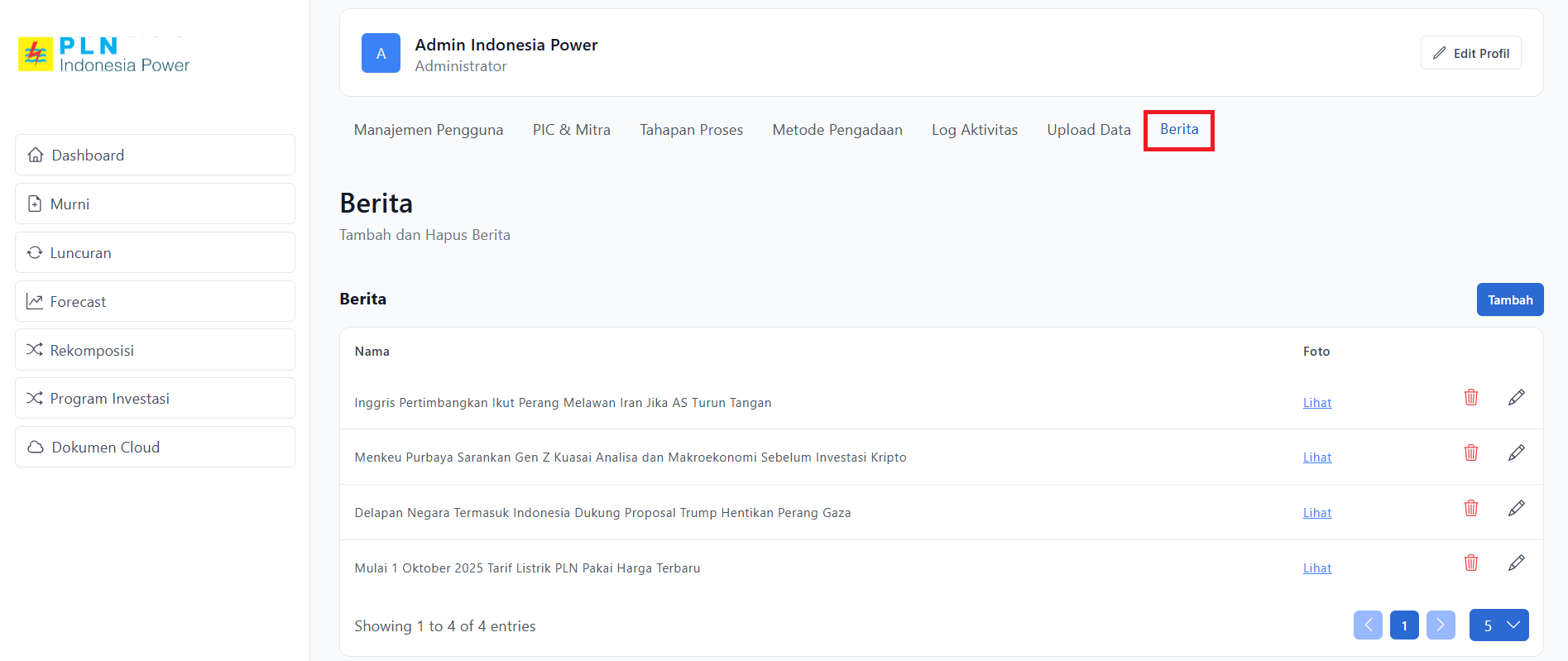 Fitur Berita digunakan untuk menambahkan, mengubah dan menghapus berita, kebijakan maupun informasi penting lain yang relevan dengan program investasi. Berita yang ditampilkan bisa berupa teks dan gambar.