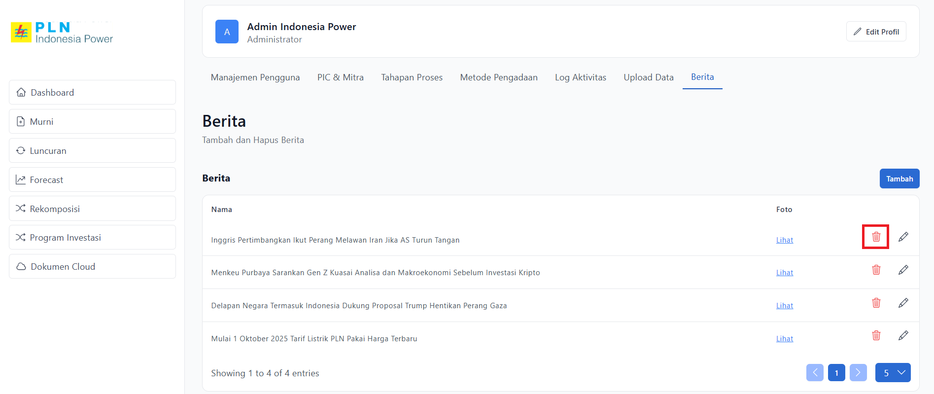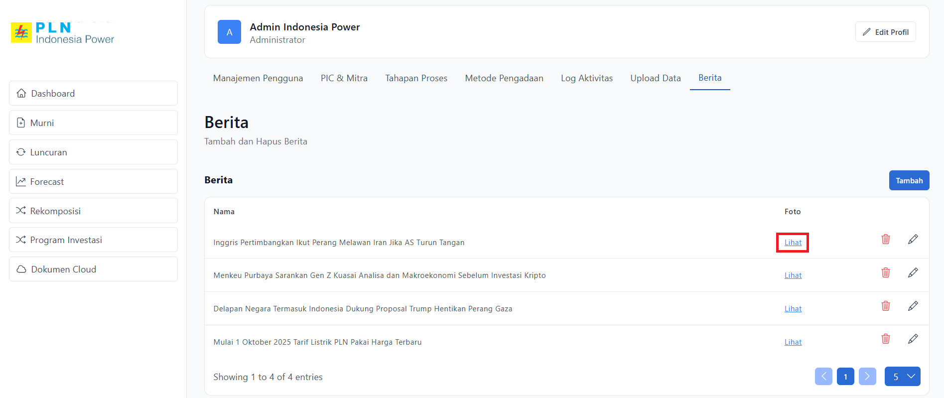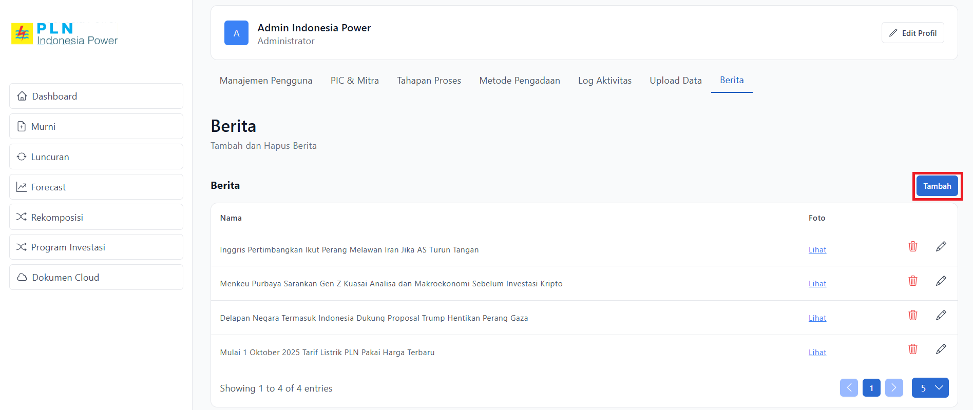 Fitur Berita digunakan untuk menambahkan, mengubah dan menghapus berita, kebijakan maupun informasi penting lain yang relevan dengan program investasi. Berita yang ditampilkan bisa berupa teks dan gambar.