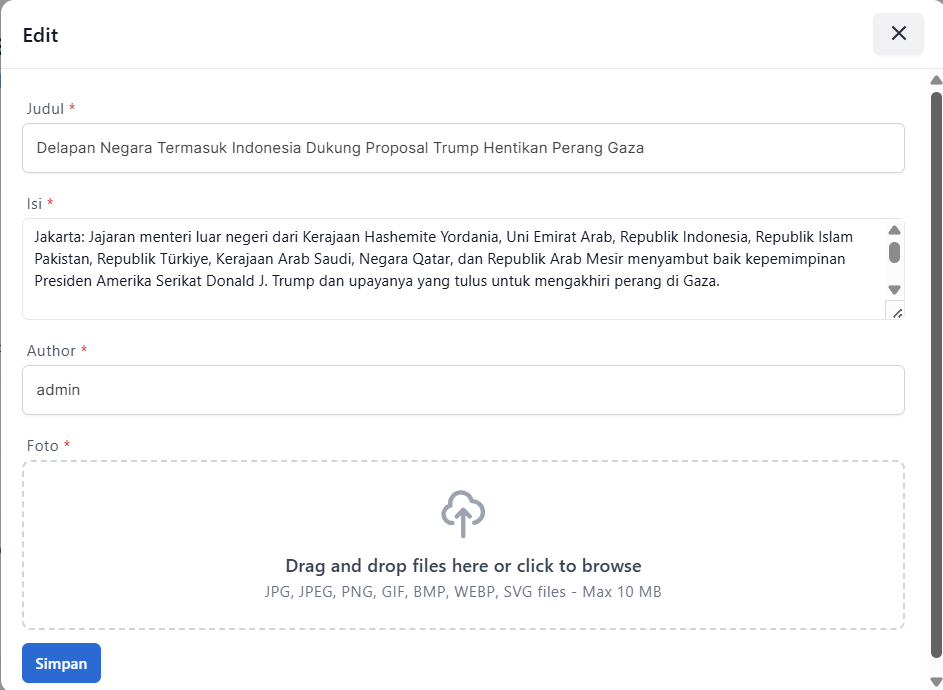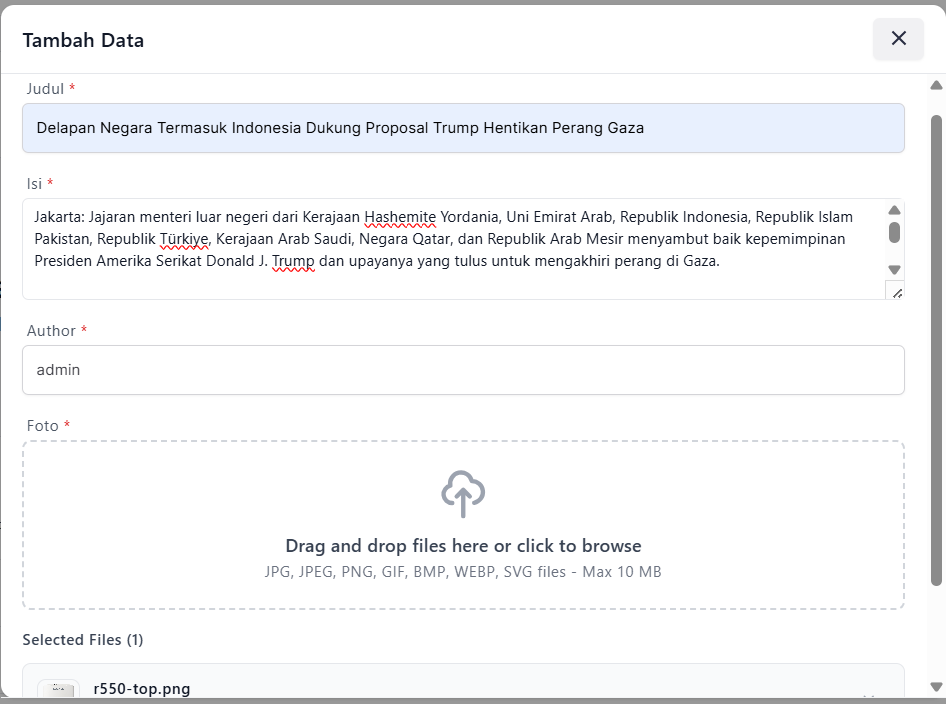 - Foto → Upload gambar yang relevan dengan berita menggunakan format: JPG, JPEG, PNG, GIF, BMP, WEBP, SVG dengan ukuran maksimal 10 MB.