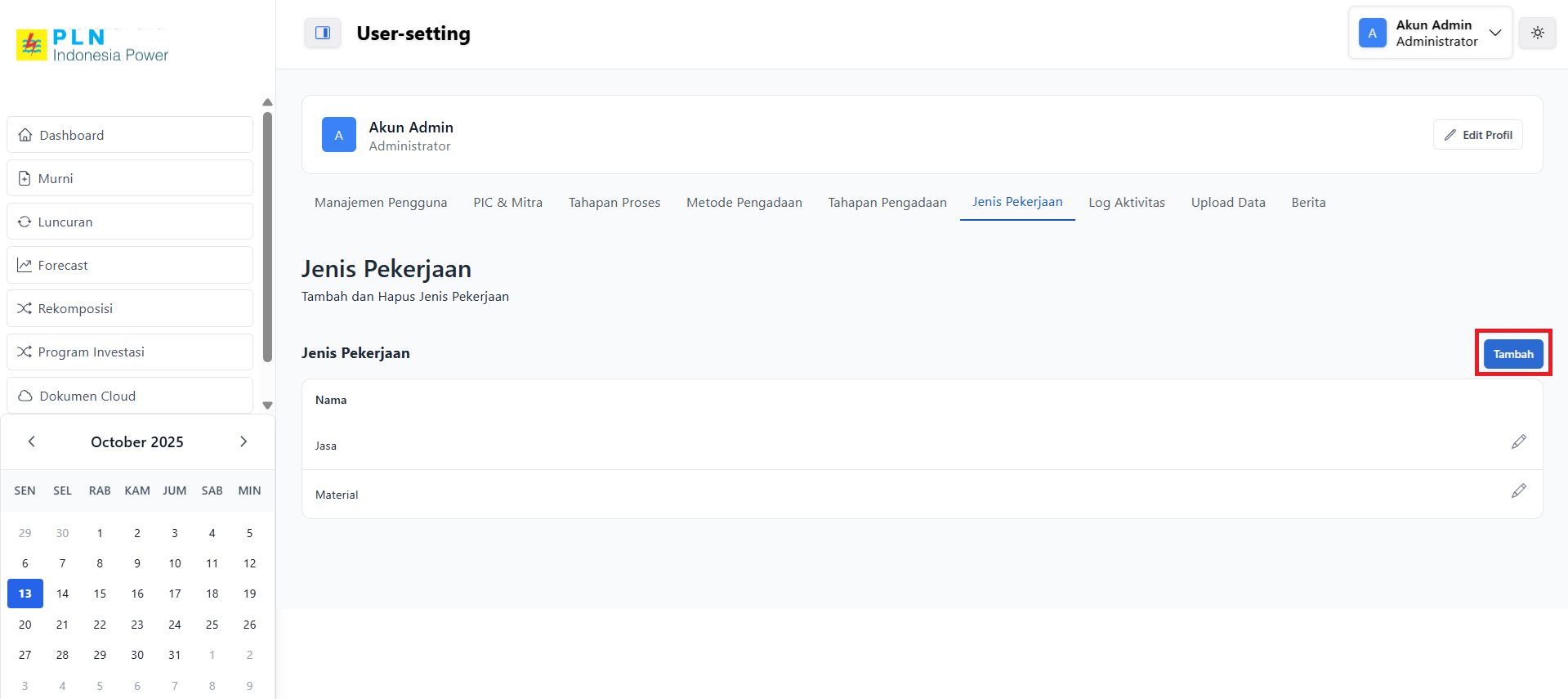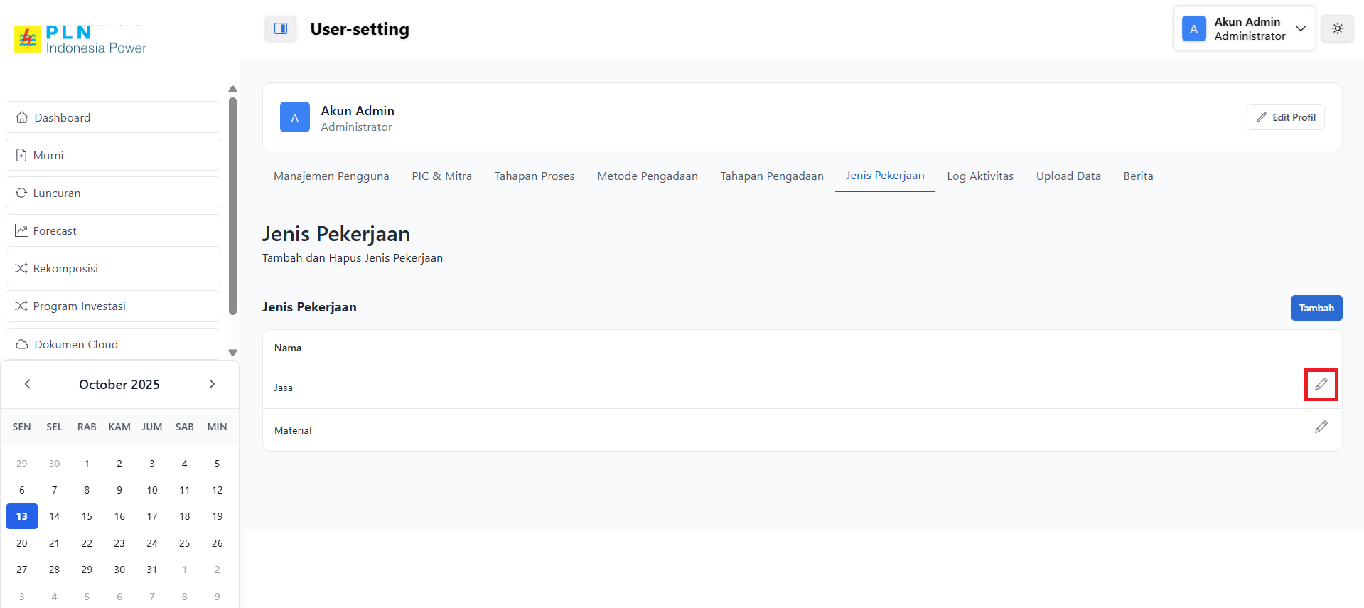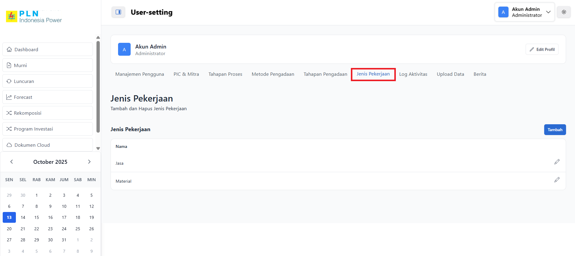 Ketika Login ke aplikasi menggunakan akun administrator, Pada sidebar sebelah kanan terdapat fitur dropdown Admin Indonesia Power yang akan menampilkan menu pengaturan akun.