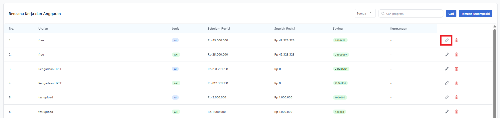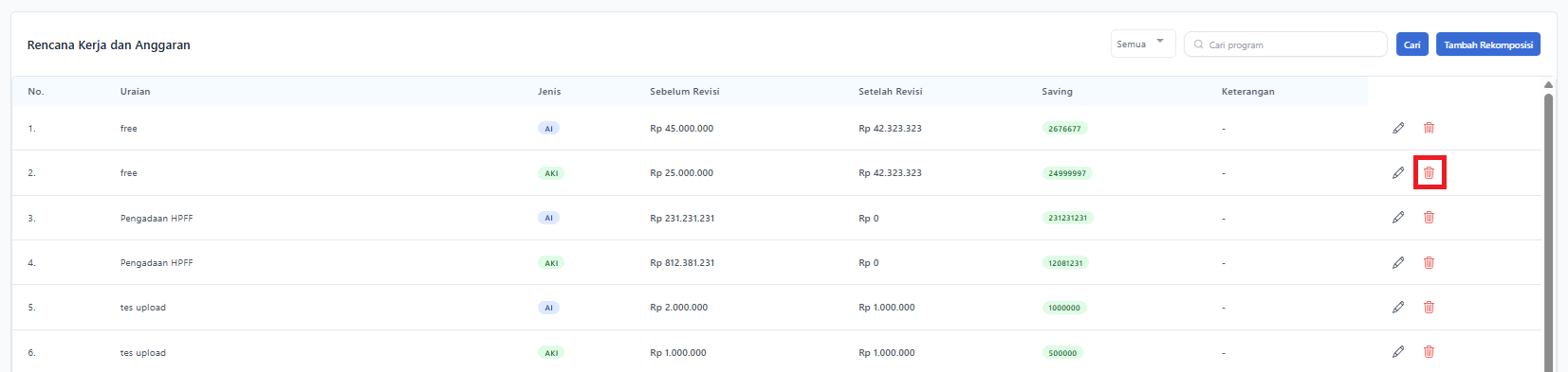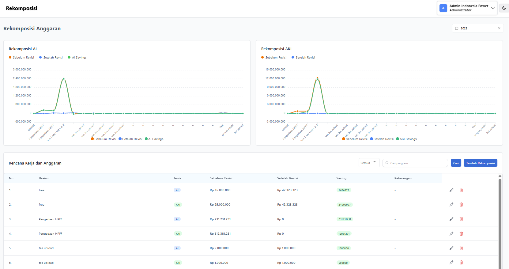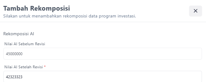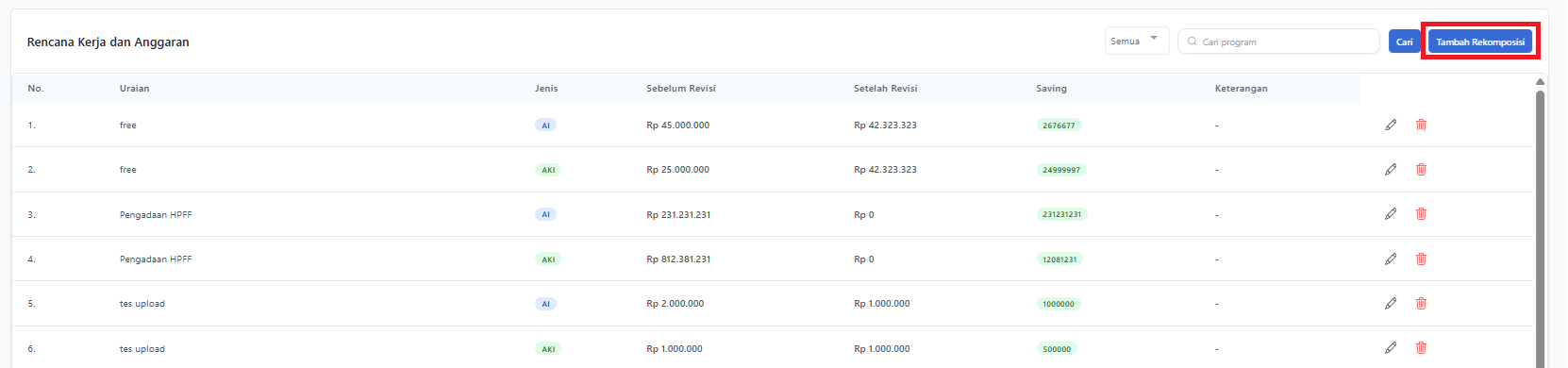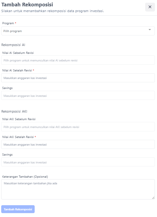 Menu Rekomposisi digunakan untuk mencatat perubahan (revisi) terhadap nilai anggaran yang telah direncanakan, baik untuk AI (Anggaran Investasi) maupun AKI (Anggaran Kegiatan Investasi). Tujuannya adalah untuk melihat perbandingan anggaran sebelum dan sesudah revisi, serta menghitung penghematan atau selisih anggaran (savings).