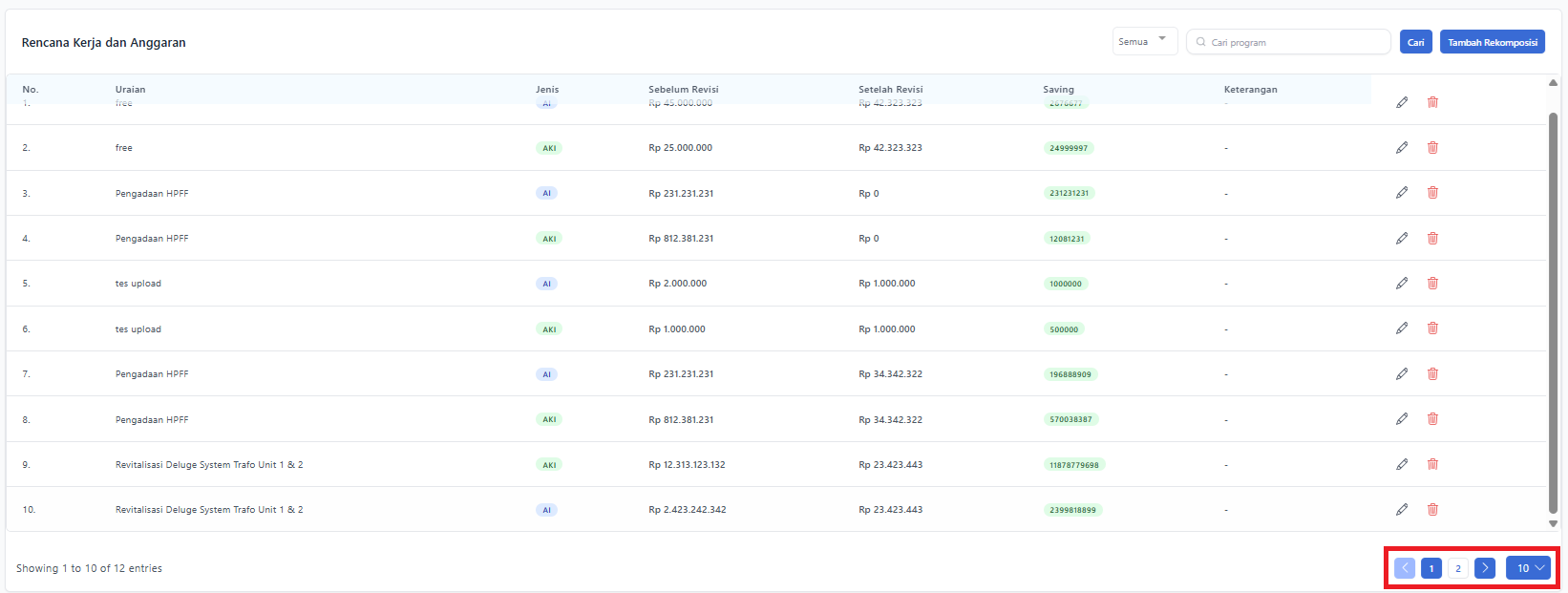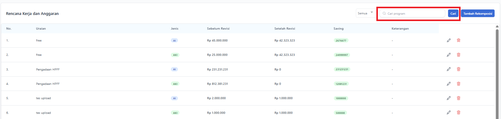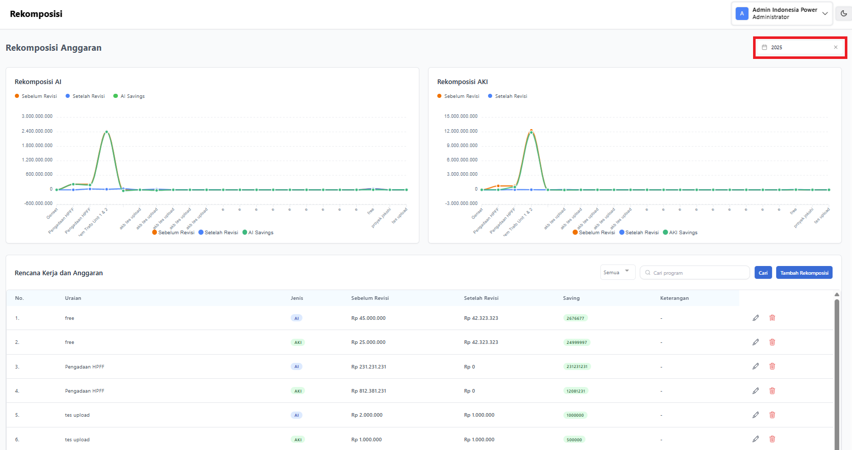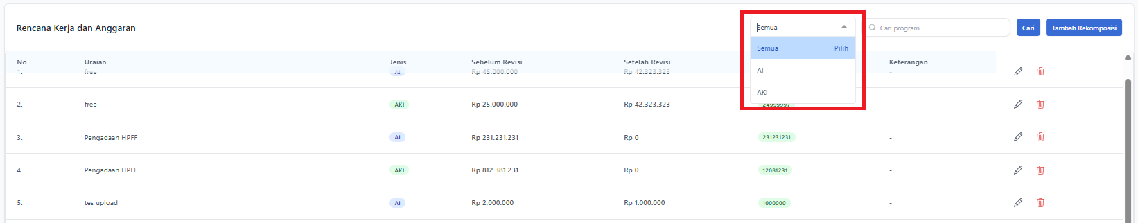 Menu Rekomposisi digunakan untuk mencatat perubahan (revisi) terhadap nilai anggaran yang telah direncanakan, baik untuk AI (Anggaran Investasi) maupun AKI (Anggaran Kegiatan Investasi). Tujuannya adalah untuk melihat perbandingan anggaran sebelum dan sesudah revisi, serta menghitung penghematan atau selisih anggaran (savings).